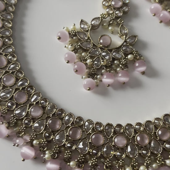 Adorable polki baby pink necklace set with Mona Lisa stones.