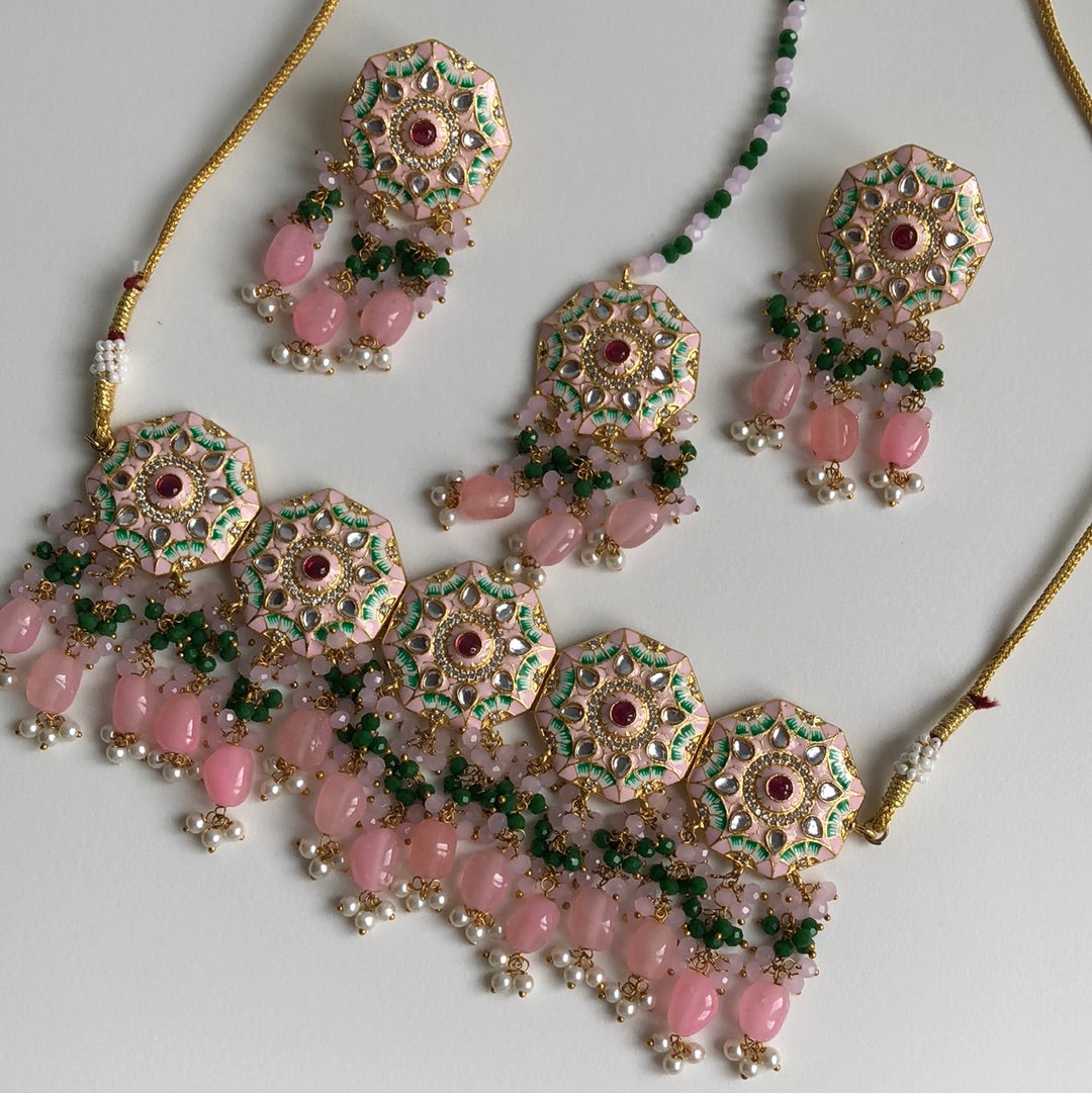 Blush Pink & Green Choker Necklace Earring Tikka Set