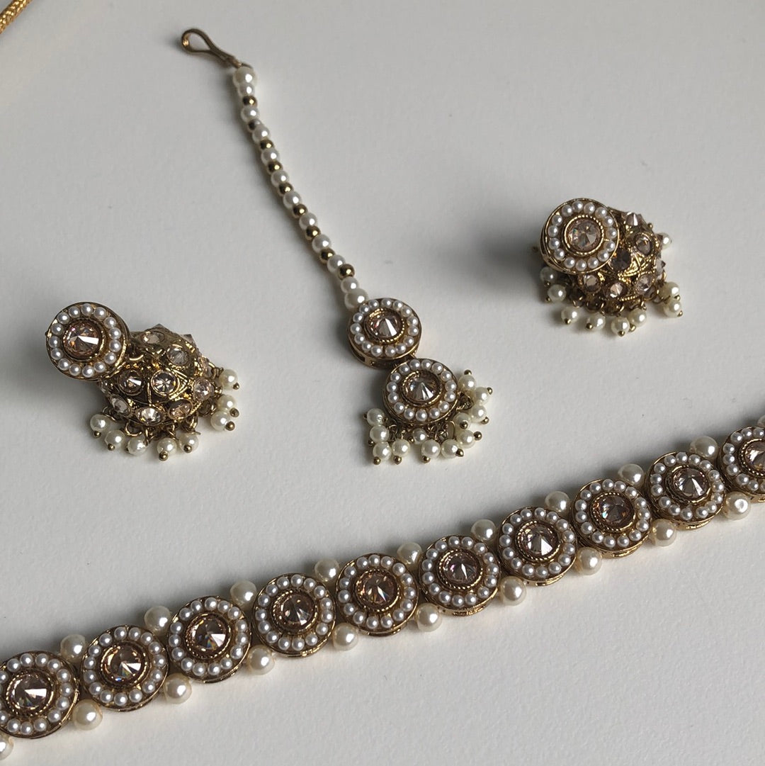 Circle Gold Pearl Choker Jumke Necklace Earring Tikka Set