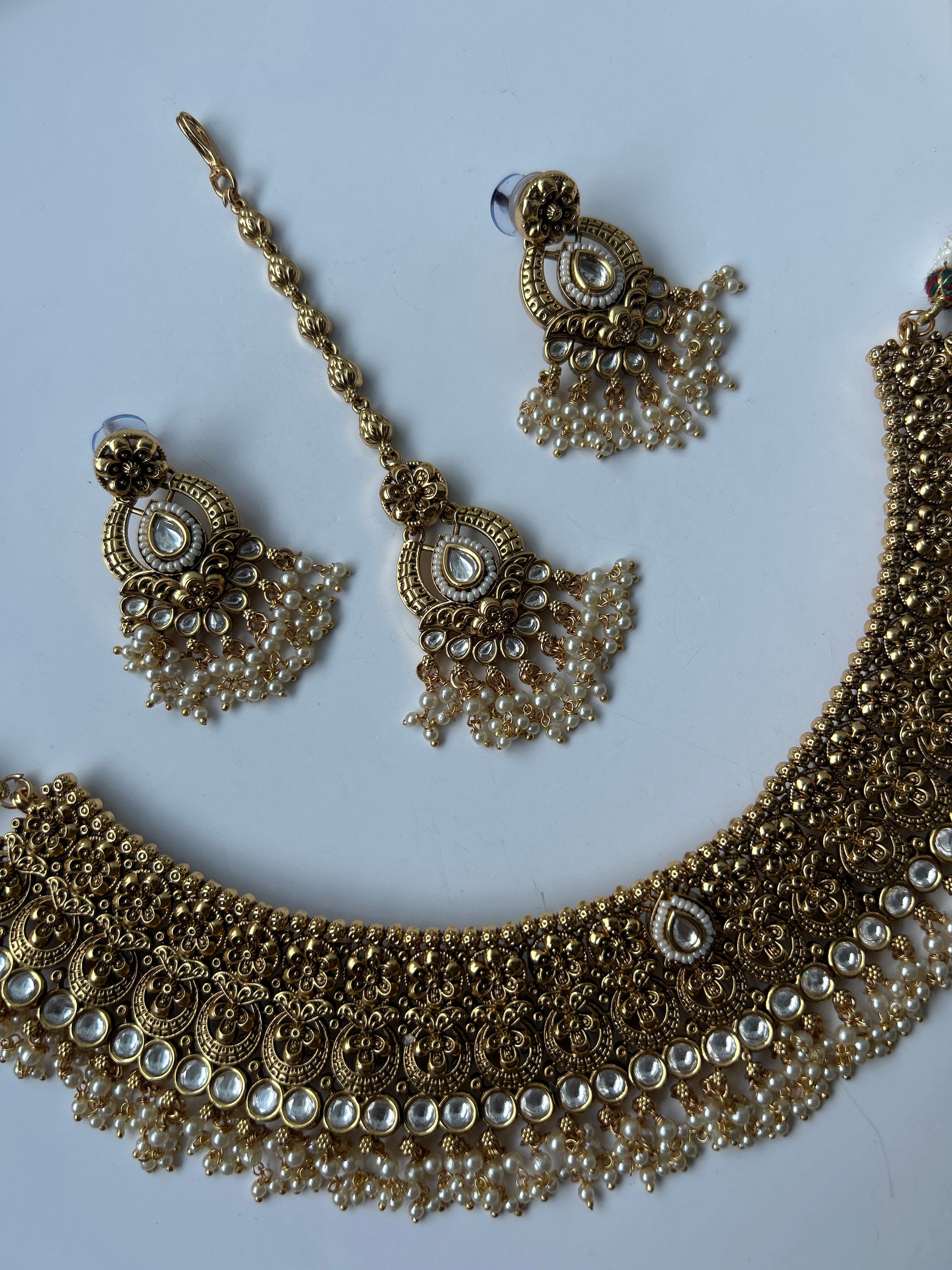 Elegant Faux Gold White Necklace Earrings Tikka Set