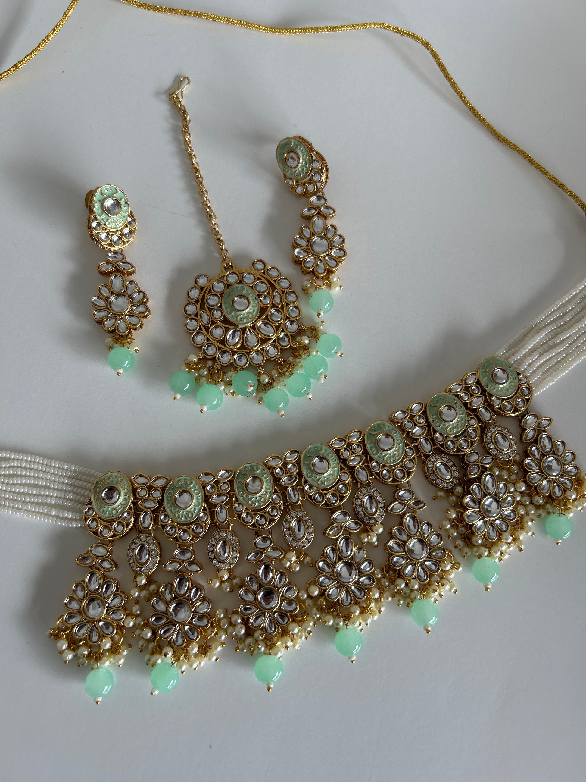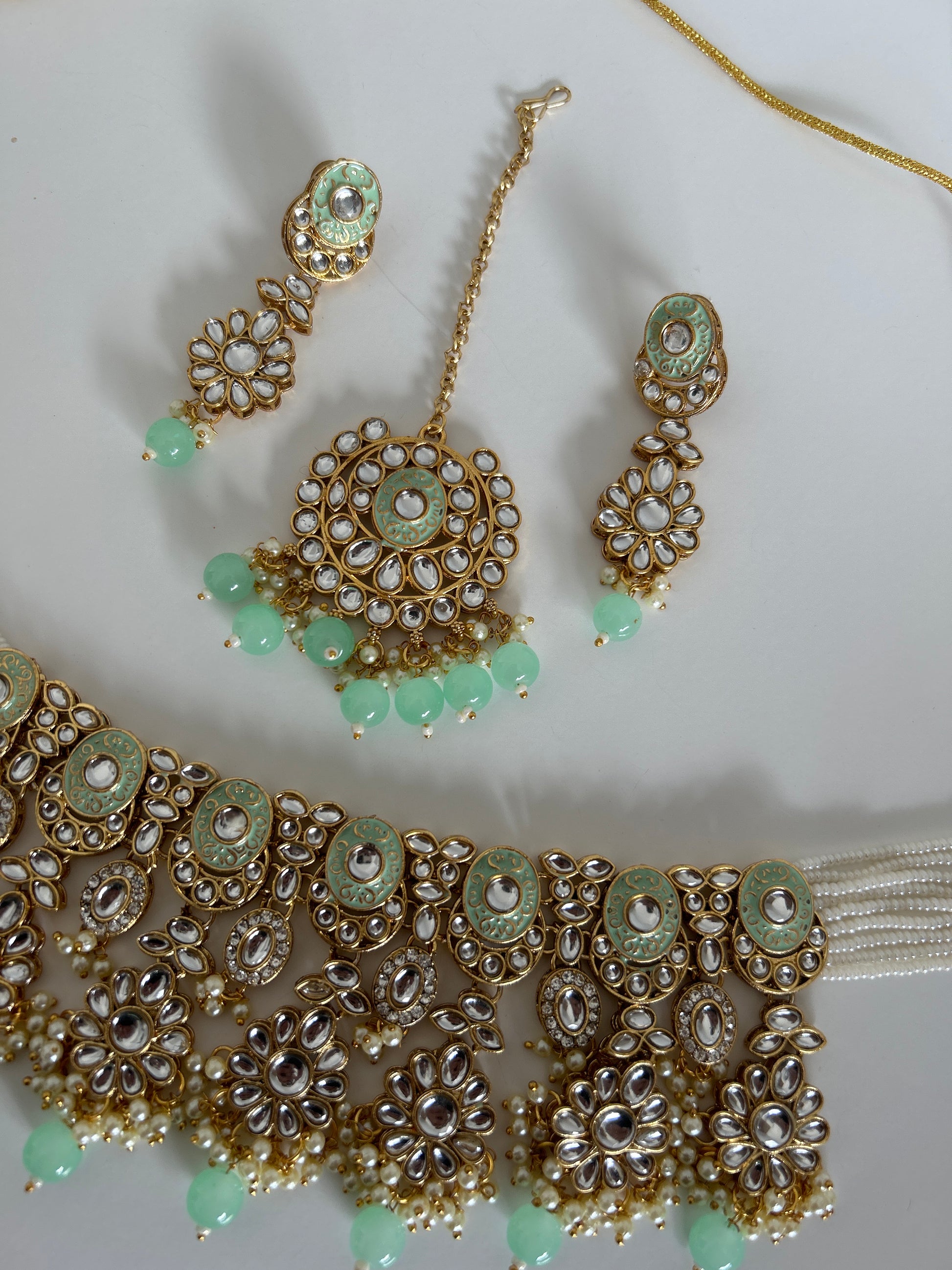 Green crystal necklace earrings tikka set