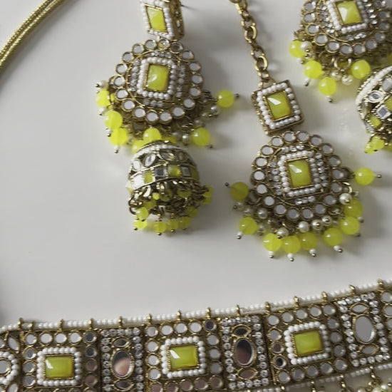 Gorgeous lemon yellow mirror choker set with pearls and jumkes.