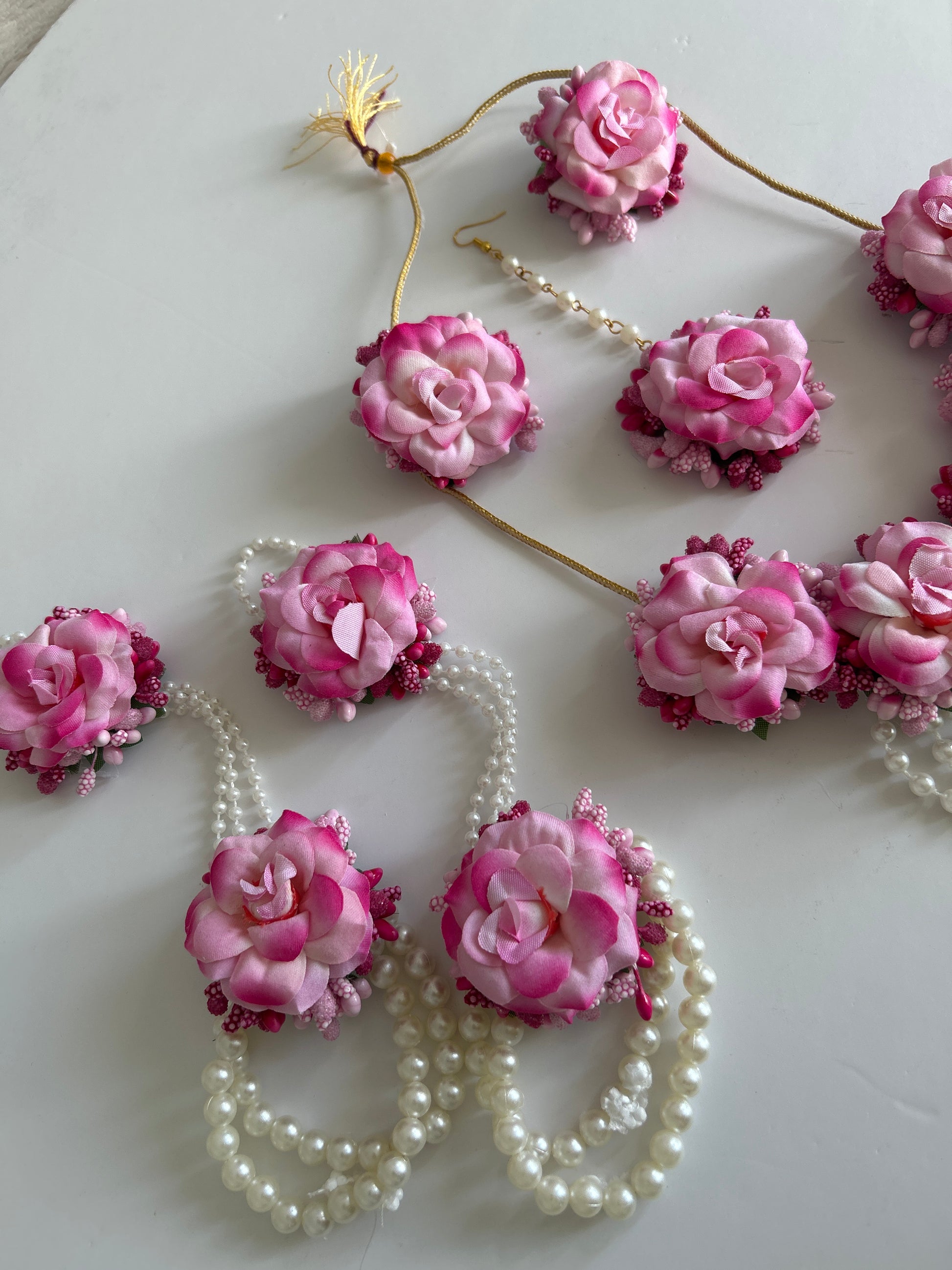 Pink Floral Pearl Necklace Earrings Tikka Set