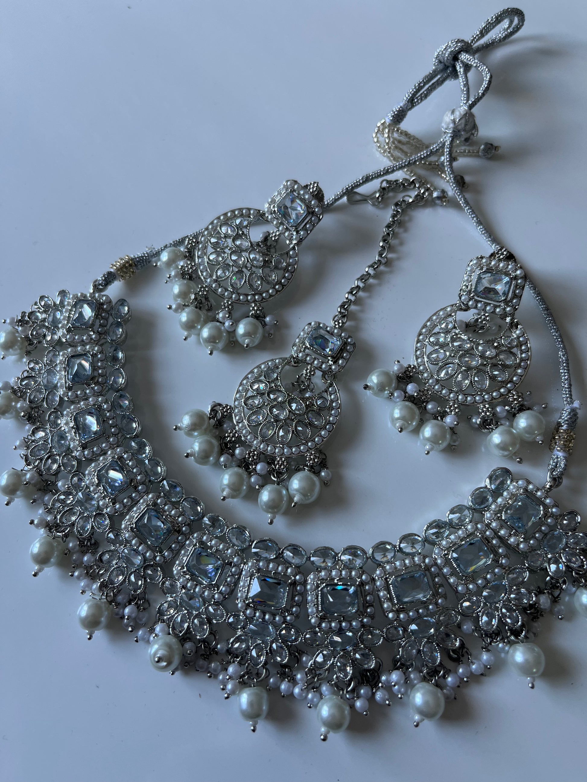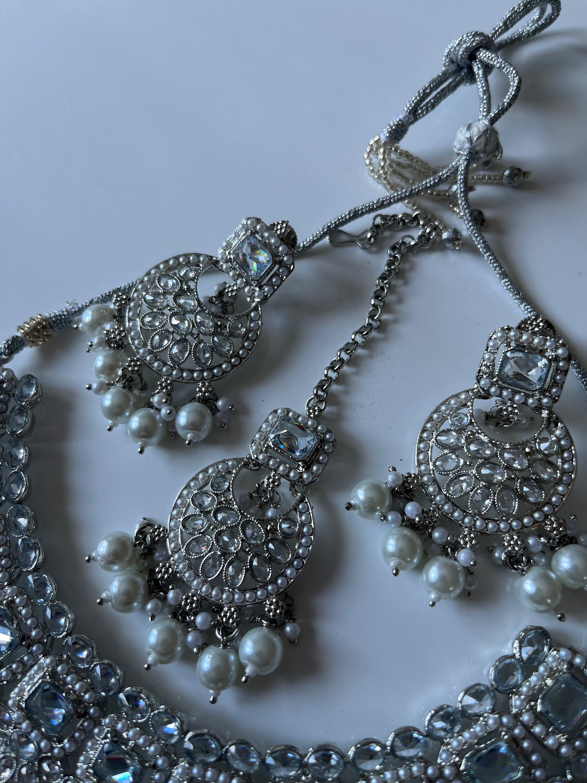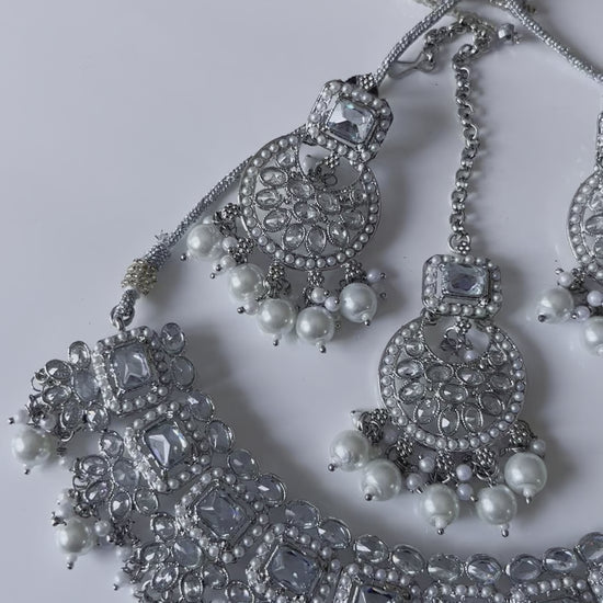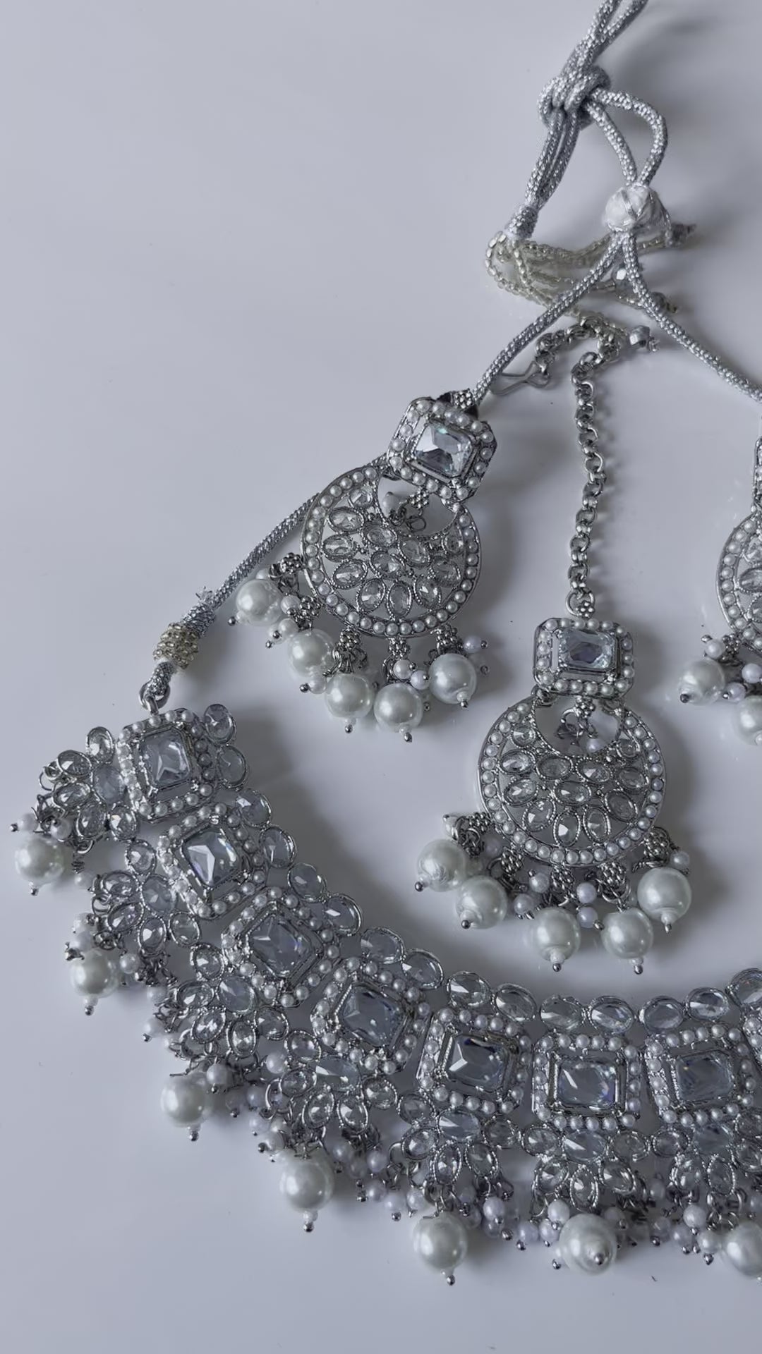 Stunning Silver Pearl Necklace Earring Tikka Set
